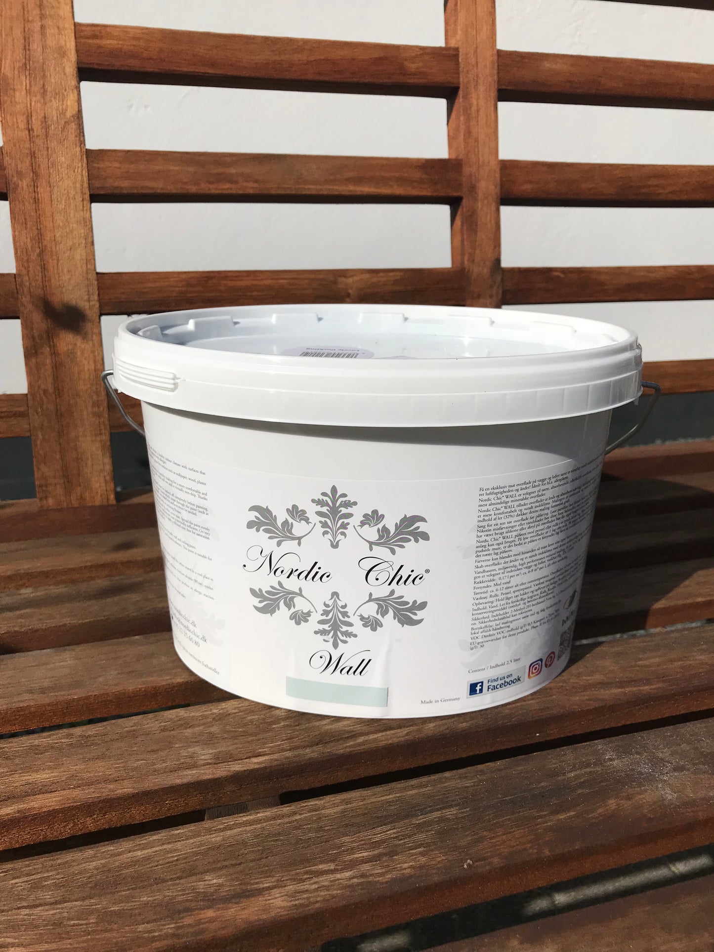 Nordic Chic® Wall comes in a 2.5 liter container. It is available in 6 colours. Like the furniture paint, the colors can be mixed and toned to you own personal edition. The coverage is fantastic, some surfaces only need one coat. 6-8 m2 per liter.